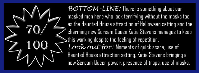 The defence of Haunt :: The setting is the one thing that gives this movie the big advantage, and Halloween world with a haunted attraction is what the world never gets tired of watching, and has immense possibilities even without trying too hard. The movie does manage to keep the blood and gore checked, keeping the violence from going too far, as this is a slasher movie made to kill most of its characters in brutal ways, with a setting like this. There are some sequences of terror which comes in, and brings the needed feeling for the audience. It works with the usual fears, and uses them effectively on different occasions created here. There is also a likable protagonist being brought here, and due to what she has been going through, we support her all the time. The masks and the people behind them are terrifying enough to watch, and the movie lives up to its haunted environment, also adding something for the scream queen to shine in the end.