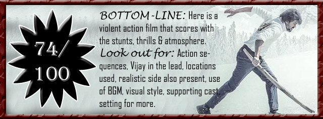 What is the movie about? :: Parthiban (Vijay) is an animal rescuer and a chocolate-specialized café owner who is now settled in Theog, Himachal Pradesh. He lives with his wife Sathya (Trisha Krishnan) and two children Siddharth (Mathew Thomas) and Mathi (Iyal) in a cottage which is located some distance away from the main town. Their only family friends are Forest Ranger Joshy Andrews (Gautham Vasudev Menon) and his wife Priya Joshy Andrews (Priya Anand). Parthiban wishes to keep himself away from public attention, which he somewhat manages to do despite him being able to tame a hyena which attacks the town with the help of Joshy and Siddharth. But when his café is attacked by a group of robbers and one of them tries to sexually harass his employee Shruthi (Janany Kunaseelan), he takes matters into his hands, and seeing his daughter in grave danger, ends up murdering all of them using their gun, despite never having used any firearms before. The court declares it self-defense, but the family of one of the robbers swear vengeance and his photos also become part of different newspapers all around India.