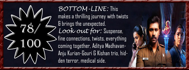 What is the movie about? :: Assistant Commissioner of Police, Madhav (Aditya Madhavan), gets a strange case in his hands, something which feels too unnatural, especially with the inability to find the identity of a number of people who died on the road in an accident which seemed to have resulted in an explosion. To add to the twisted situation, he understands that the three dead women were blind, while one of them had died much earlier, not due to the burns. Also, to further surprise, the man who died with them was not the driver, who seems to be missing. The accident feels like created by the dead man who was a thief, but his death, explosion, woman who died earlier and the missing man seems to make no sense. He is supported by the inspectors Beena (Anju Kurian) and Gajendran (Munishkanth), who also try to make sense out of the complicated situation. Madhav is engaged to Dr. Madhumitha (Gouri G. Kishan), who is working at a local hospital, but due to busy schedules, rarely find time to spend with each other. As nobody has come to claim the bodies, Madhav figures out that the dead people might be orphans and extends the investigation in that direction.