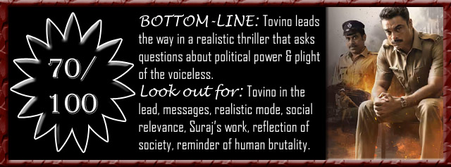 What is the movie about? :: Varghese (Tovino Thomas) has been living a usual small-town life having a lot of time spent with his love from school days, Nancy (Priyamvada Krishnan), despite the disapproval of her father. Varghese has been employed since forever, as he keeps looking for a good job, ending up getting none, while Nancy has been employed in a bank for some time. Along with the same, Nancy’s father is a rich man running a number of business ventures with his influential family members, while Varghese’s family has the history of his father committing suicide due to financial problems, from where they never recovered. This makes the marriage alliance almost impossible between them, and both families are aware of the same. Finally, after being forced by Nancy, he decides to take up the job of a police constable, even though he continues to wish for much more. He thinks that he will study for the Public Service Commission tests while working as a constable in the police force.