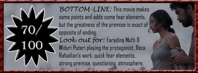 How it finishes :: This movie travels in a different path from the other Indonesian movies reviewed by me, but surely is not better than them. Impetigore, Gundala, Photocopier and Ivanna are surely ahead of this particular movie more with content than anything else – they also seemed to have a bigger canvas for characters. There was so much that this movie could have done after that fine beginning, and the struggle could have meant more, but it seems to be happy with what all are already around, and that surely feels safe. To claim safety, it might have left its core behind, but remains an interesting work with enough dose of horror here and there, even though getting too stretchy in between. A better ending would have been more satisfactory, but we are okay with what we have. The Indonesian movies are surely having some interesting elements and the experimentation is surely on the right path. There is always a lot more that we can expect in this particular industry.