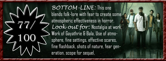 The defence of Pechi :: The movie thrives on its atmosphere and an ancient tale of folklore than runs right through it. Bala Saravanan comes up with the best among the cast, and he plays the only fully sane person around there who seems to understand the gravity of the situation – we remember him in those funny sequences of Godha. Gayathrie Shankar, the actress of Nna Thaan Case Kodu, has provided a memorable performance here, and excels in the last few moments and the flashbacks. The rest of the cast nicely follows the procedure as a cabin in the woods, or lost in the forest tale would unfold. The antagonist here is strong, and is not just another demonic presence – it is the kind of creature from where escape seems almost impossible. There are the moments which provide us with those quick scares and above that, there are the times when it keeps us scared at all times. The fear factor with an inescapable fate brings the terror here. Along with that, the visuals are too good, whether of horror or of the green and dark woods.