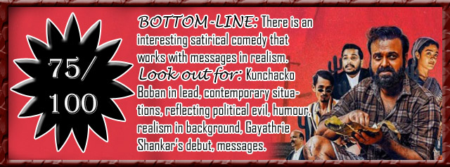 The performers of the soul :: Kunchacko Boban had shown signs of changing track from the old romantic hero and the man of humour through the thrillers like Anjaam Paathira, Nayattu, Pada and Nizhal, and even moved further from the true love elements with his Bheemante Vazhi. This one has him in another avatar which we are going to remember, as it is so much dependent on him, even though other performers are not far behind with the moments that they get – the problem is that we don’t really know the names of most of them, but we can appreciate them as a whole, as the cast seems be very well prepared to suit the world of this movie. Gayathrie Shankar makes a fine entry into Malayalam cinema, but as she plays a Tamil labourer and never speaks anything in Malayalam, the true entrance to the industry would still have to wait – she has surely come with a very good supporting performance though. Among the actors, Gangadharan Kuttamath who plays the protagonist’s advocate and PP Kunhikrishnan who plays the magistrate are to be specially noted. But most of the humour is effectively handled by Rajesh Madhavan and his lover, whose name we don’t know – their moments led to to the whole theatre breaking into laughter.