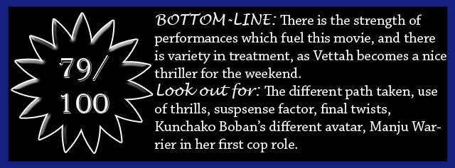 The claws of flaw :: It can be seen that some of the characters do disappear in the second half, and at least some them deserved to have a better role in the latter stages. There could have been some investigation going on here too, with the missing parts being found out rather than revealed. The second half of the movie goes in an entirely different path in comparison with the first half – even though movies like Drishyam also did the same, the core had remained the same in that case. The movie could have also been better if the small details were taken care of, and if there was not that much of predictability in the final stages. The movie also reminds one of the flicks like Mikhael and The Great Father with the dark mood and the kind of problems as well as the antagonists that the main characters have to deal with – but this one has the same one step better, and has a comic side which those movies completely lacked. There is also some violence to make some people uncomfortable.