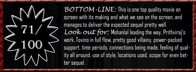 How it finishes :: L2: Empuraan has proven to be strong sequel to a movie which made the difference like no other. It depends on the first film to extend the impact and keeps itself in a struggle to make the canvas a lot bigger. It is successful in making the whole thing feel bigger, but not that bigger in the quality of content. The mystery of the main character has already been revealed, and in this one, he is too powerful to be in any kind of danger and for us to feel for the person. As a treat for the fans, and for the high quality making, this would stay on for longer. The success of this movie is a certainty and we hope that it would get more collections than the movie which leads the list of Malayalam movies which managed to get the highest collections. The effort that has been put in here would need our appreciation, and it deserves to be at its top. We would be waiting to see how far it goes after breaking all records.