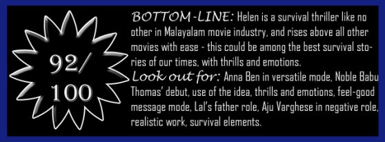 How it finishes :: Helen is a well-made survival thriller, maybe the best of its kind not just in Malayalam, but also in any Indian language. With limited resources, the movie provides a fine experience, an emotional and thrilling ride, with a strong feel-good factor. Christopher Marlowe in Doctor Faustus called Helen of Troy from Illiad as the face that launched a thousand ships and burnt the topless towers of Ilium. Helen of Sparta and later Troy, was someone who started a war with her newfound choice, and here, Helen is someone who would wage a war against a frozen world, not causing one between a city on the northwest coast of Turkey and the allied Greek states. Helen of Troy was someone who did the unthinkable with her elopement, but here, she chooses not to go with her lover, but becomes the epitome of will-power and not beauty. There is that unparalleled charm in this movie which you shouldn’t miss. Watch a beautiful song from the movie below.