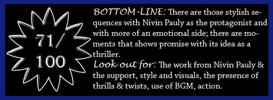 The defence of Mikhael :: The movie is high on style and action sequences, but one can note that it never really goes too far, as it keeps away from elements like flying villains, hero who knows everything before it happens, and all. The music is mostly good and at times excellent, with very few exceptions that we can notice. There are those mass elements, but they are kept in control unlike The Great Father and Abrahaminte Santhathikal which had the same director’s hands firmly on them in one way or the other, or Masterpiece which had so much of the same – the heroism as well as the whole story itself is far more believable, and has better and smarter twists with this one. The thrills are present all the time, and the emotional side works pretty well. The visual style is very nice, and the same rises above the rest. The dialogues are powerful, and Mikhael is a movie that doesn’t hesitate to come up with some moments which are above a normal movie in the industry.