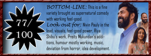 The claws of flaw :: The eternity of opportunities provided here and not taken, seemingly due to innovative choices beyond the safe zone not being implemented by the makers. Some moments surely feel like not needed as the movie is a little bit too long for this type of a content – some characters are just around there for the sake of being present. The background tale of the ghostly girl feels half-baked as there is not much of a clarity around there, despite the ambiguous ending being okay. The overall strength is often lost at times. Still, the makers should remember that this is working as a feel-good movie and not horror comedy, and therefore the mysteries are better left understood rather than keeping something for another ghost in the sequel which would haunt with more strength. Even though the ghostly girl claims to be Mar Thoma, there are moments which make one feel that the person is more Catholic with her beliefs, which seems to be a serious misconception related to faith, something which was seen in a more miserable fashion in Georgettante Pooram.