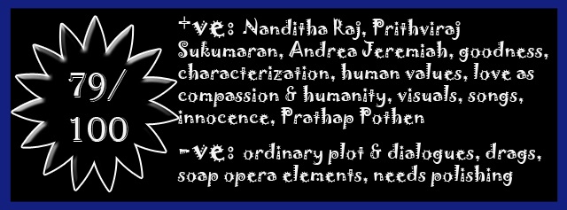 The defence of Drama :: The movie does deal with a situation that could happen very often in future – it is more or less something which has been dealt with in a realistic manner. When we consider the number of our relatives outside India, it makes about twenty five percent, and if it is about someone who is outside Kerala, that can make up to seventy five percent of the total number of people. The movie certainly shows a reality that a lot of people are going to face. The older generation will have their houses and funerals in trouble soon enough. There will be those busy times at some point, when their opinions will not ever come to being something that the new generation will listen to. But it is all based on money, isn’t it? The movie is also a morality tale, with money finally becoming the least important thing. The flick also has some comedy in there, and the visuals when showing England, is pretty good.